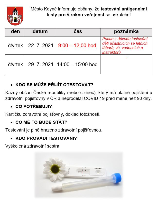 Z důvodu testování dětí účastnících se letních táborů upozorňujeme, že čas testování je dne 22. 7. 2021 posunut již od 9:00 do 12:00 hod.