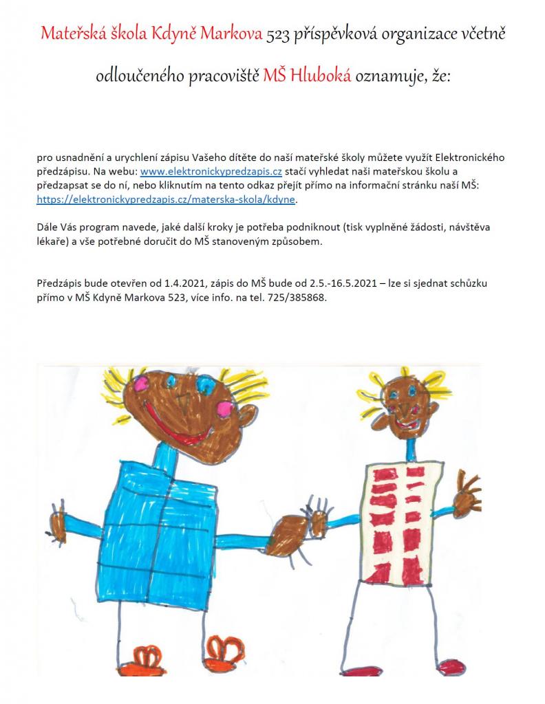 Předzápis bude otevřen od 1. dubna 2021, zápis do MŠ bude od 2. 5. - 16. 5. 2021 – lze si sjednat schůzku přímo v MŠ Kdyně Markova 523, více informací lze získat na tel. 725 385 868.