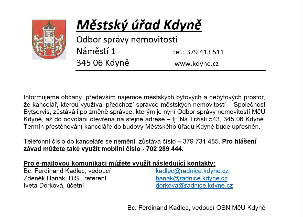 Informujeme občany, především nájemce městských bytových a nebytových prostor, že kancelář, kterou využíval předchozí správce městských nemovitostí – Společnost Bytservis, zůstává i po změně správce, kterým je nyní Odbor správy nemovitostí MěÚ Kdyně, až do odvolání otevřena na stejné adrese – tj. Na Tržišti 543, 345 06 Kdyně. Termín přestěhování kanceláře do budovy Městského úřadu Kdyně bude upřesněn.
