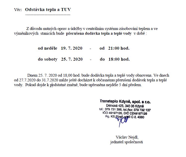 Transteplo Kdyně oznamuje, že z důvodu nutných oprav a údržby v centrálním systému zásobování teplem a ve výměníkových stanicích bude přerušena dodávka tepla a teplé vody.