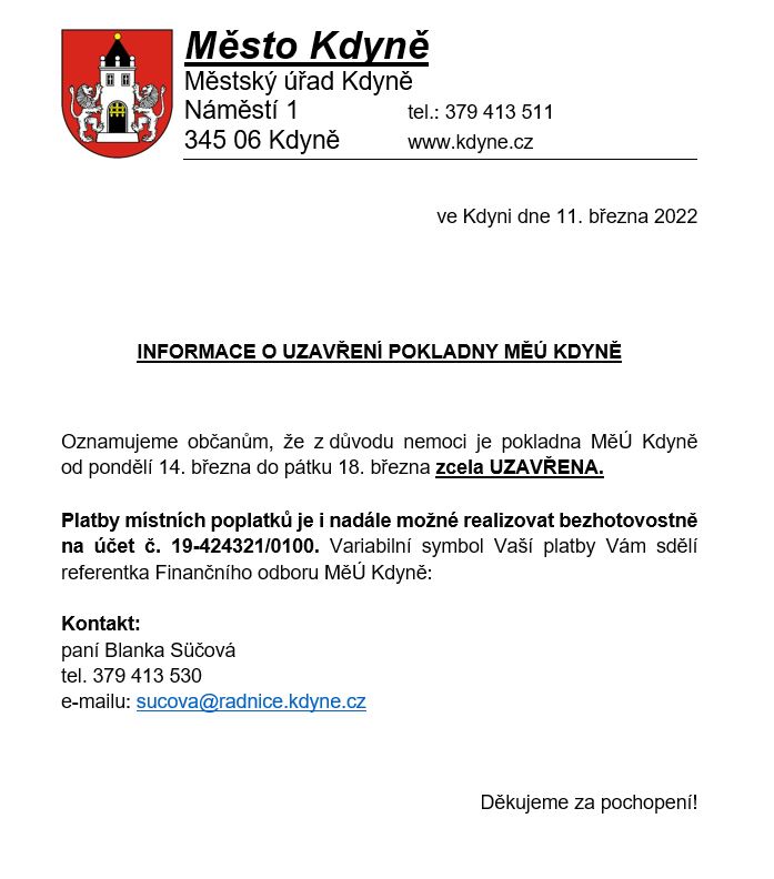 Informujeme občany, že z důvodu nemoci je pokladna MěÚ Kdyně v příštím týdnu (tj. v termínu 14. - 18. 3. 2022) ZCELA UZAVŘENÁ.