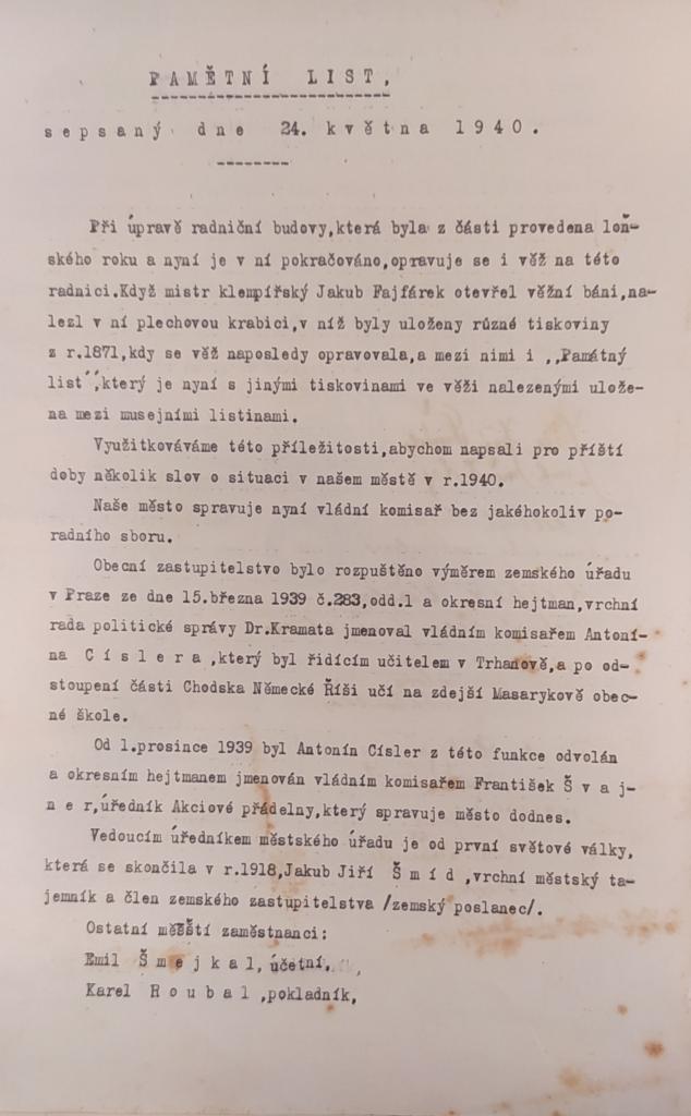 Pamětní list, sepsaný dne 24. 5. 1940 vrchním tajemníkem Jakubem Jiřím Šmídem, byl spolu s dalšími dobovými materiály ukryt ve dvou kovových tubusech, jejichž perfektní utěsnění umožnilo dochování všech dokumentů (fotografií, novin, pohledů, apod.) ve výborném stavu. Všechny dokumenty byly předány Státnímu okresnímu archivu Domažlice k digitalizaci a jejich bezpečnému uchování.