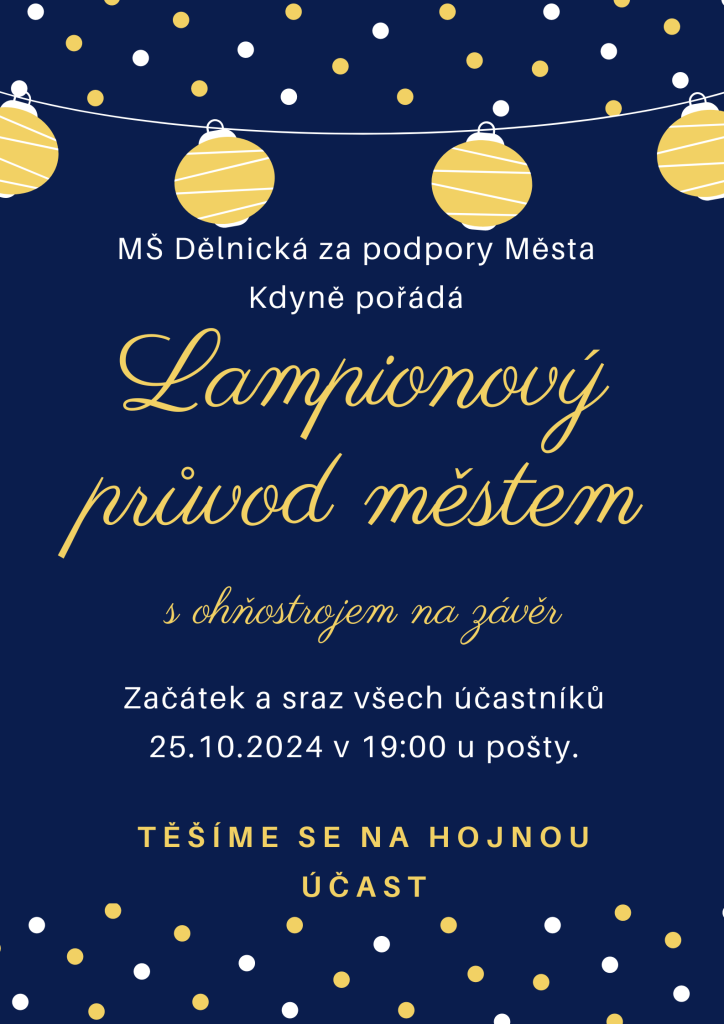 Tradiční lampionový průvod městem se uskuteční v pátek, 25. 10. 2024. Sraz účastníků je na náměstí u pošty, v 19:00 hod.