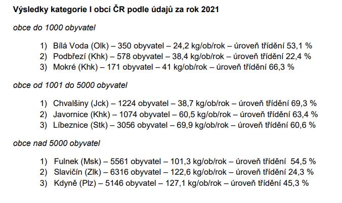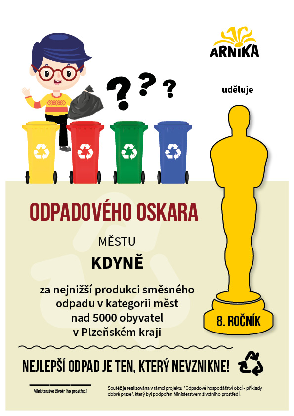 Město Kdyně se v rámci Plzeňského kraje stalo jediným pětitisícovým městem s produkcí odpadu nižší než 150 kg/obyvatele/rok. Celorepublikově se Kdyně v soutěži umístila na skvělém třetím místě! DĚKUJEME, ŽE S NÁMI TŘÍDÍTE!
