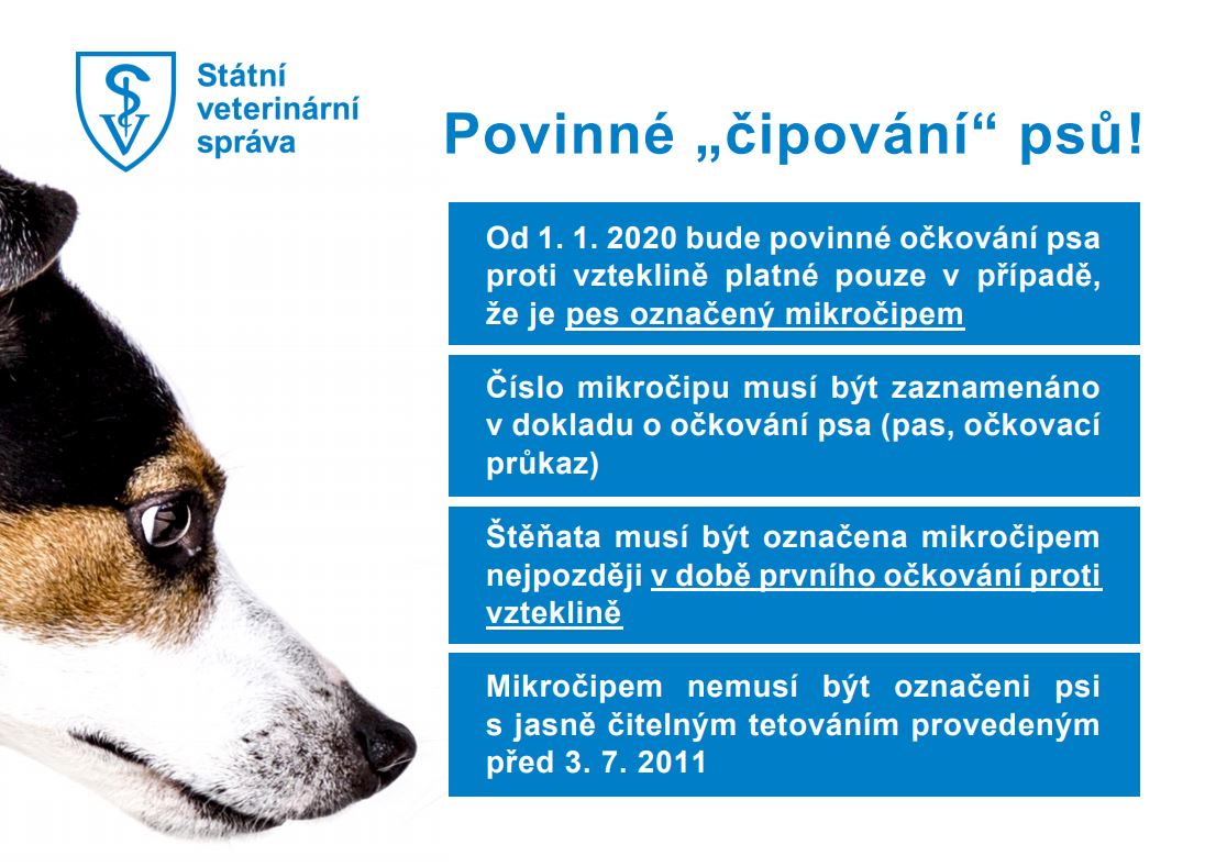 Od 1. ledna 2020 bude povinné očkování psa proti vzteklině platné pouze v případě, že je pes označený mikročipem. Od tohoto data by měl být na území České republiky označený každý pes.