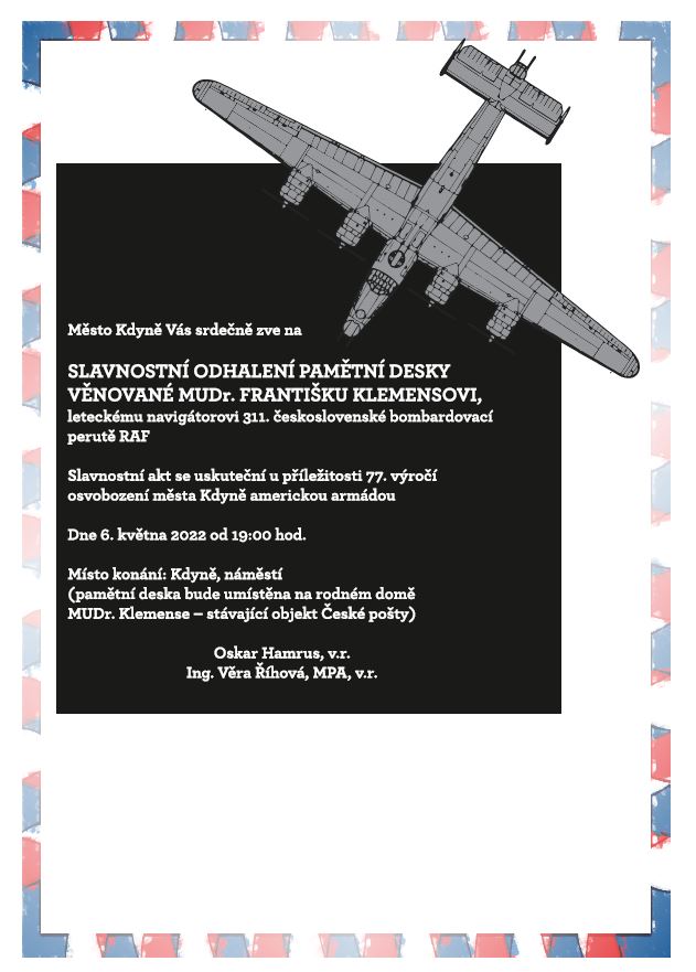 Srdečně Vás zveme na OSLAVY 77. VÝROČÍ OSVOBOZENÍ MĚSTA KDYNĚ, které se uskuteční v pátek, 6. května 2022. Vrcholným okamžikem celodenního kulturního programu bude odhalení pamětní desky věnované MUDr. Františku Klemensovi.