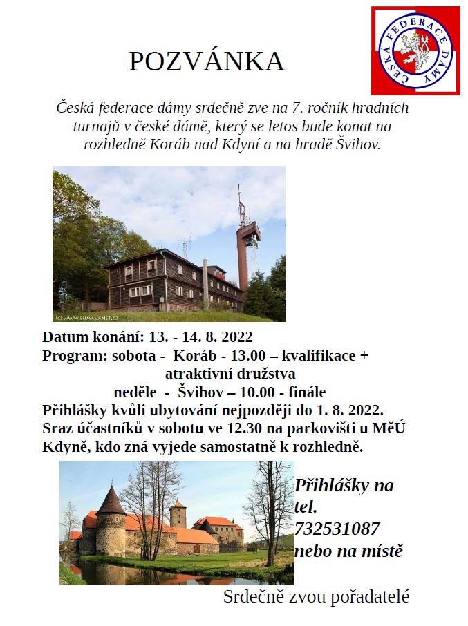Česká federace dámy srdečně zve na 7. ročník hradních turnajů v české dámě, který se letos bude konat na rozhledně Koráb nad Kdyní a na hradě Švihov.