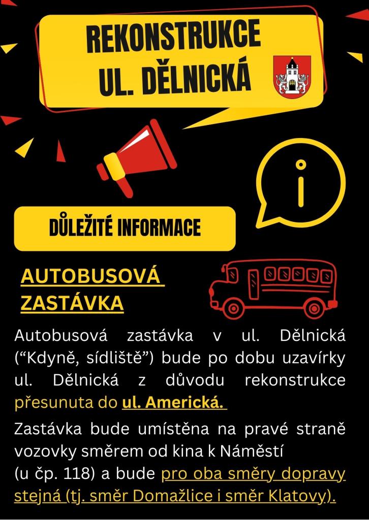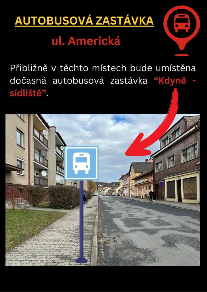 Autobusová zastávka v ul. Dělnická (“Kdyně, sídliště”) bude po dobu uzavírky ul. Dělnická z důvodu rekonstrukce přesunuta do ul. Americká.
