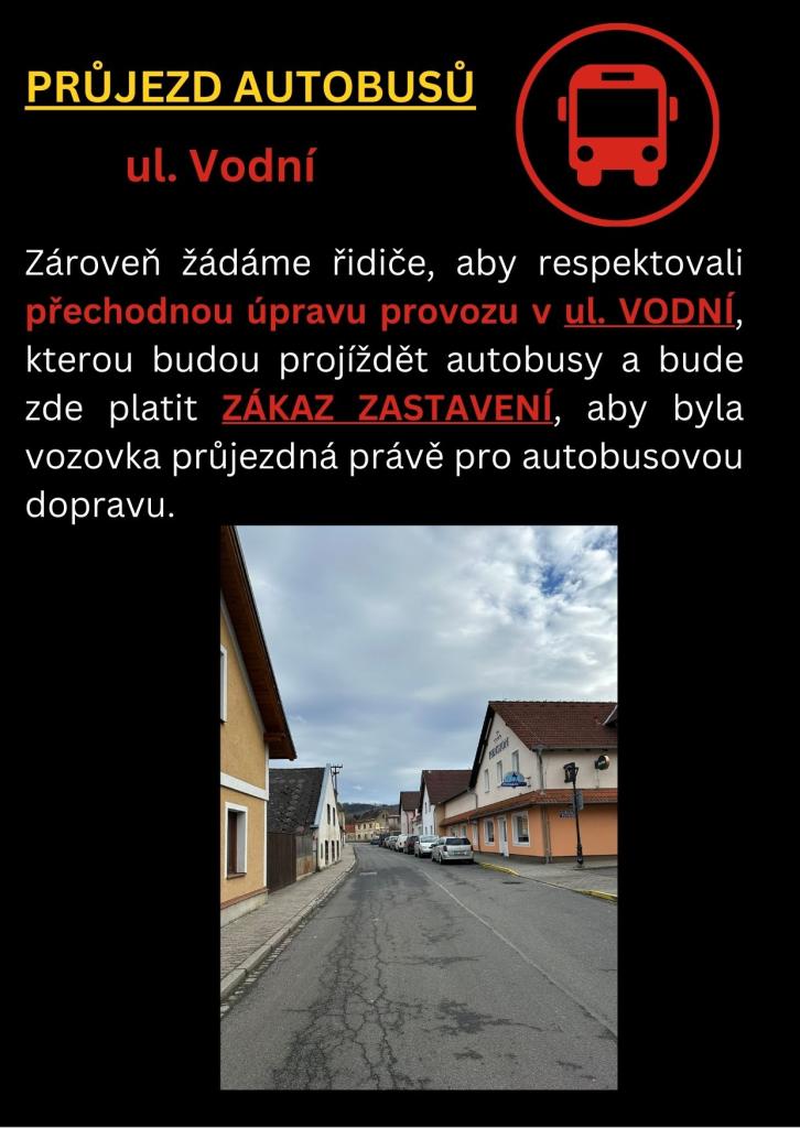 Zároveň žádáme řidiče, aby respektovali přechodnou úpravu provozu v ul. VODNÍ, kterou budou projíždět autobusy a bude zde platit ZÁKAZ ZASTAVENÍ, aby byla vozovka průjezdná právě pro autobusovou dopravu.