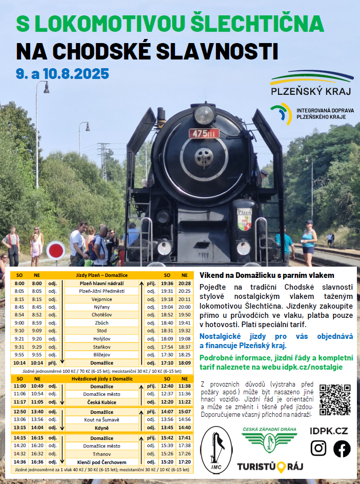 Ve dnech 9. a 10. 8. 2025 projede na trase Plzeň hl. n. - Domažlice parní lokomotiva Šlechtična. Jízdní řád a ceník k nahlédnutí v příloze.
