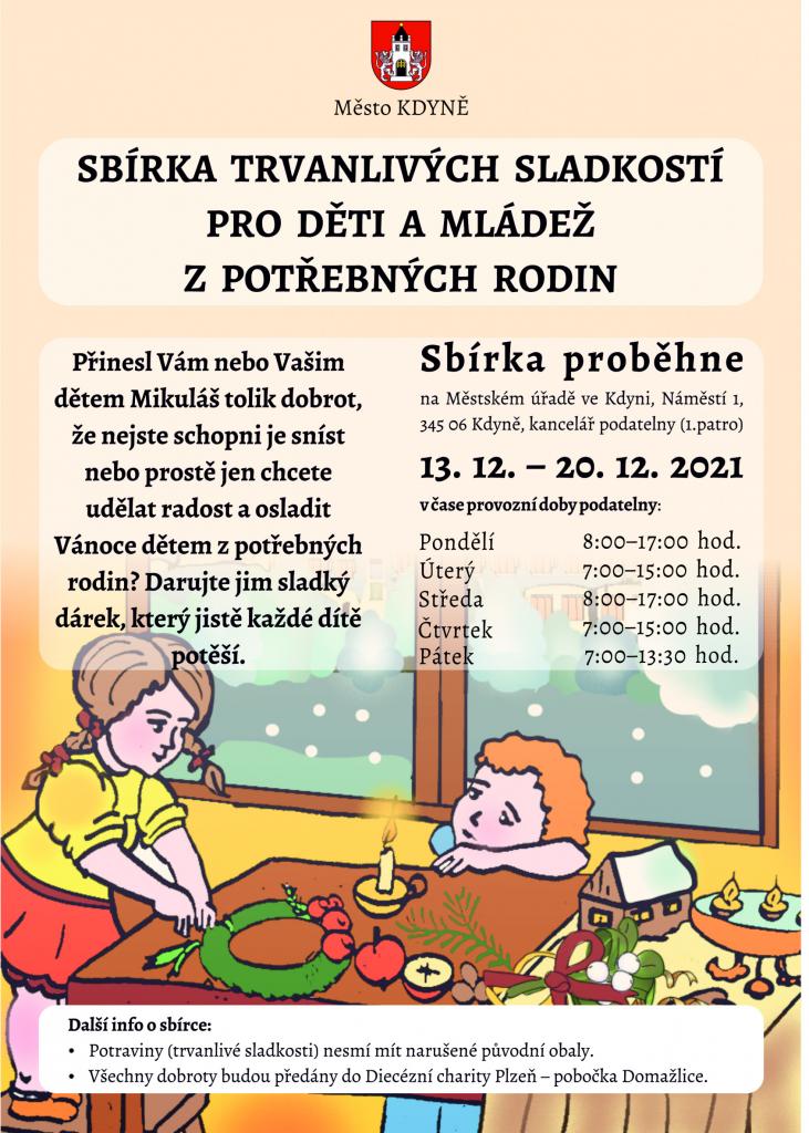 Sbírka probíhá v termínu od 13. 12. do 20. 12. 2021 na podatelně Městského úřadu Kdyně (1. patro) v provozní době podatelny:
