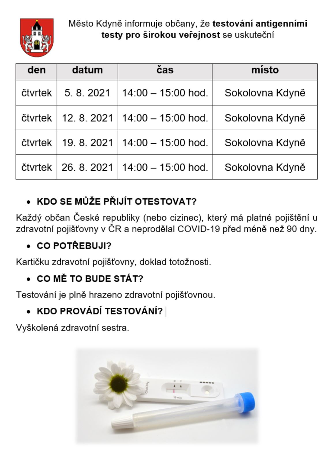 | čtvrtek | 5. 8. 2021 | 14:00 – 15:00 hod. | Sokolovna Kdyně |