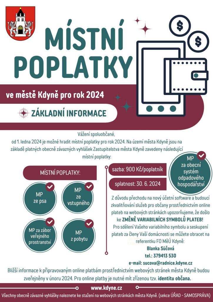 Na území města Kdyně jsou na základě platných obecně závazných vyhlášek Zastupitelstva města Kdyně zavedeny následující místní poplatky: