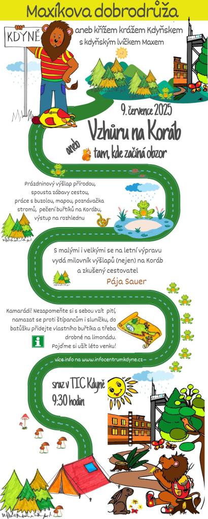 Děti, víte, jak voní prázdniny? Jako cesta loukou, mezi poli a zahrádkami! Nebo jako vůně lesních pěšinek, přes které tu a tam divočí nezbedné pramínky potoků. Maxíkova dobrodrůža zahájíme stylově. Vyrazíme totiž na opravenou chatu Koráb. Pěkně zrána, než se udělá horko, se vydáme přes louky a cestičky vstříc vysokému kopci.